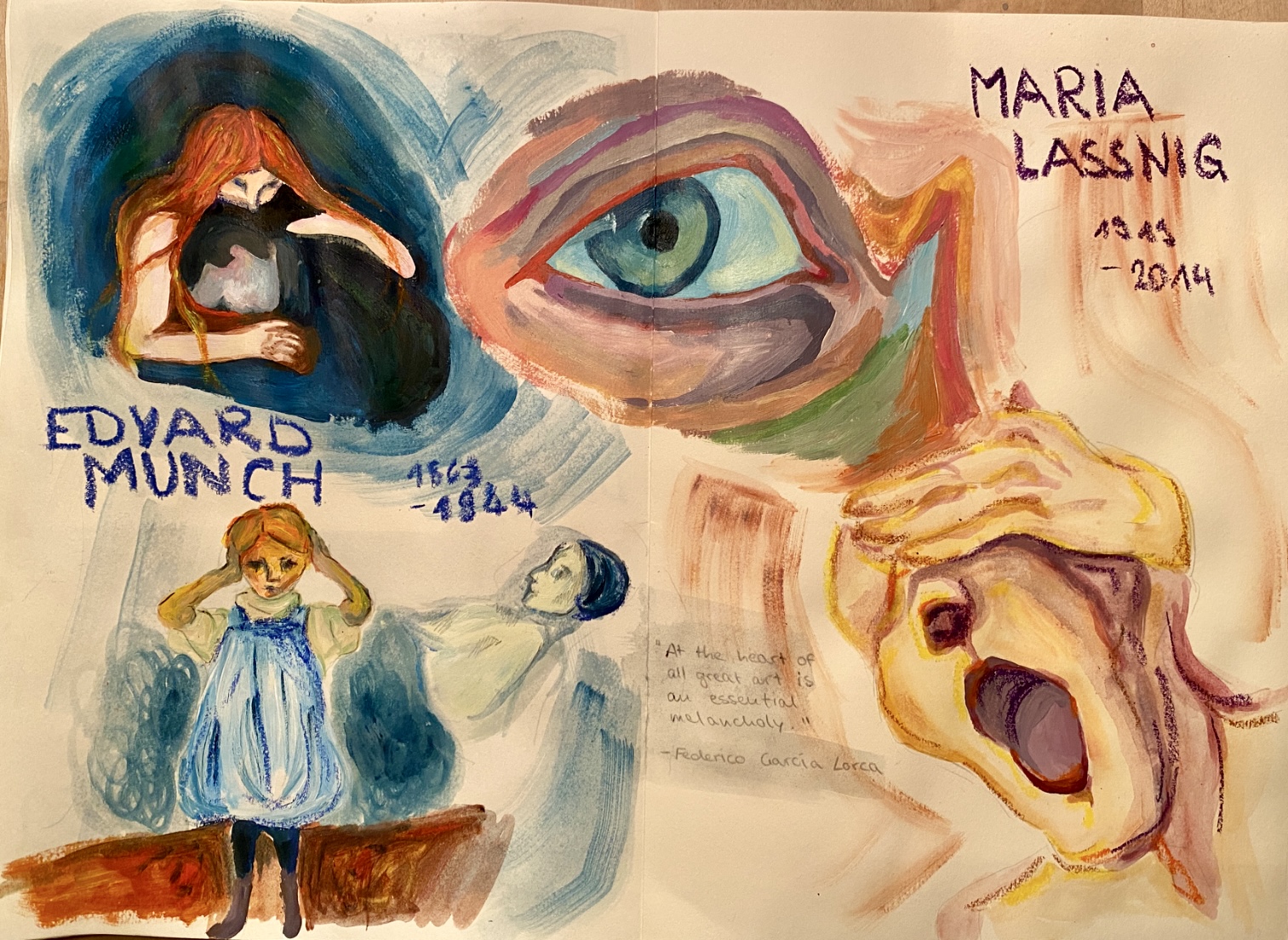 Fernsehteams, Journalisten und eben Jule, Leni und David staunten über die große Bandbreite der gezeigten 200 Arbeiten und es wurde sehr schnell deutlich, dass Lassnig und Munch zwar 56 Jahre trennten, sie jedoch geistig/ malerisch/ empathisch sehr nah beieinander waren.