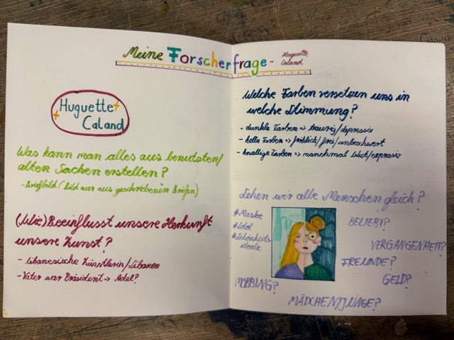 Nach Wochen des Suchens, Fragens, Verharrens, Überdenkens kam es nun für die 7a zu dem Punkt, an dem sich alles änderte. Plötzlich kam der Mut ins Spiel, Gedankenschnelle bestimmte den Arbeitsprozess und kreative Freiheit gewann über die Sorge. Raum wurde größer gedacht, Formate und Materialien erweitert. Leuchtende Augen, die sagen, dass es Spaß macht, den eigenen Weg gefunden zu haben. Noch eine Verbindung zu Huguette Caland!