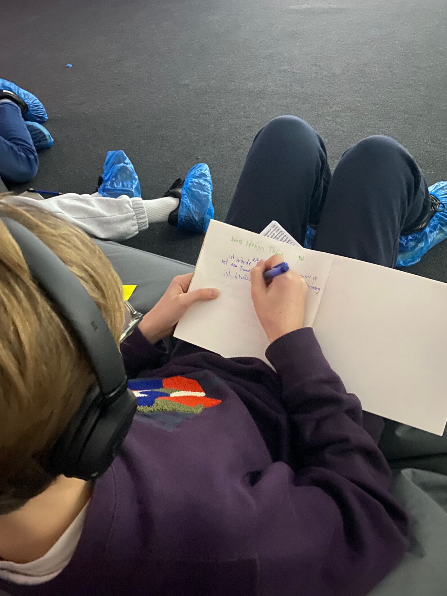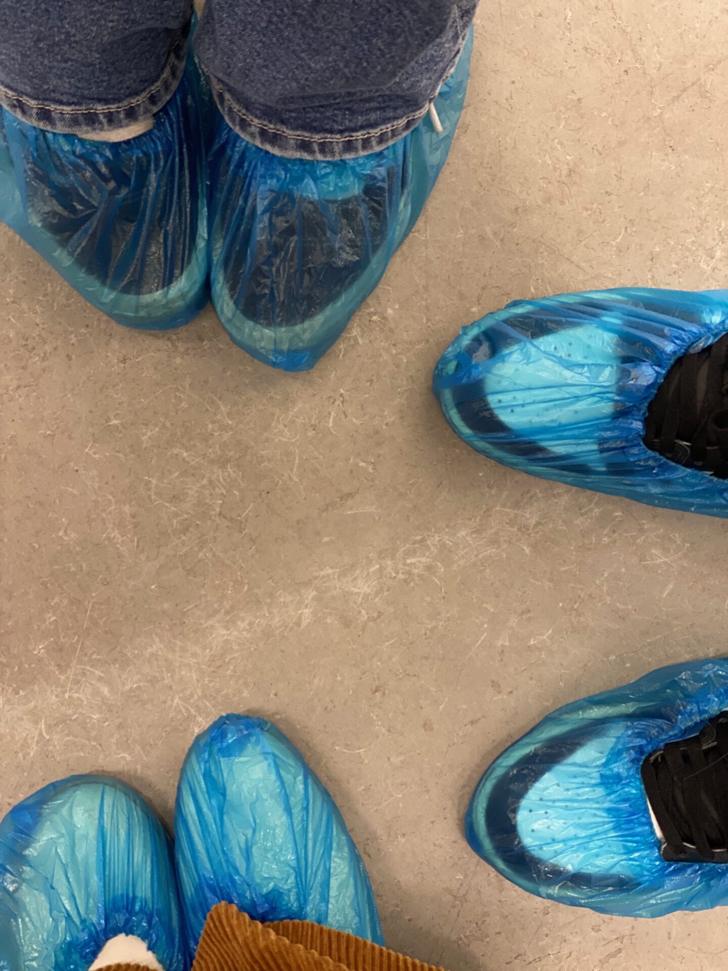 Wir ziehen uns die blauen Überzieher über die Füße. Jetzt werden wir selbst zu Forschern und Forscherinnen!