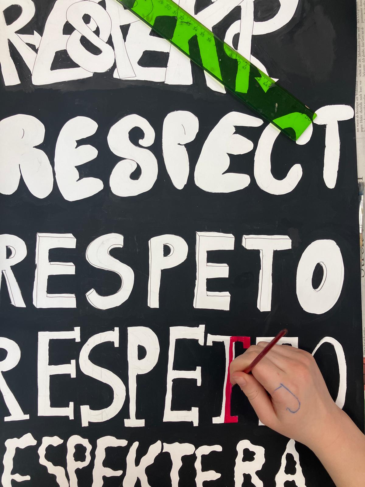 Nach dem Besuch der Ausstellung im Museum der Arbeit setzen wir uns in der Schule mit dem Thema Respekt auseinander. Dabei spüren wir, wieviele Facetten der Begriff hat.