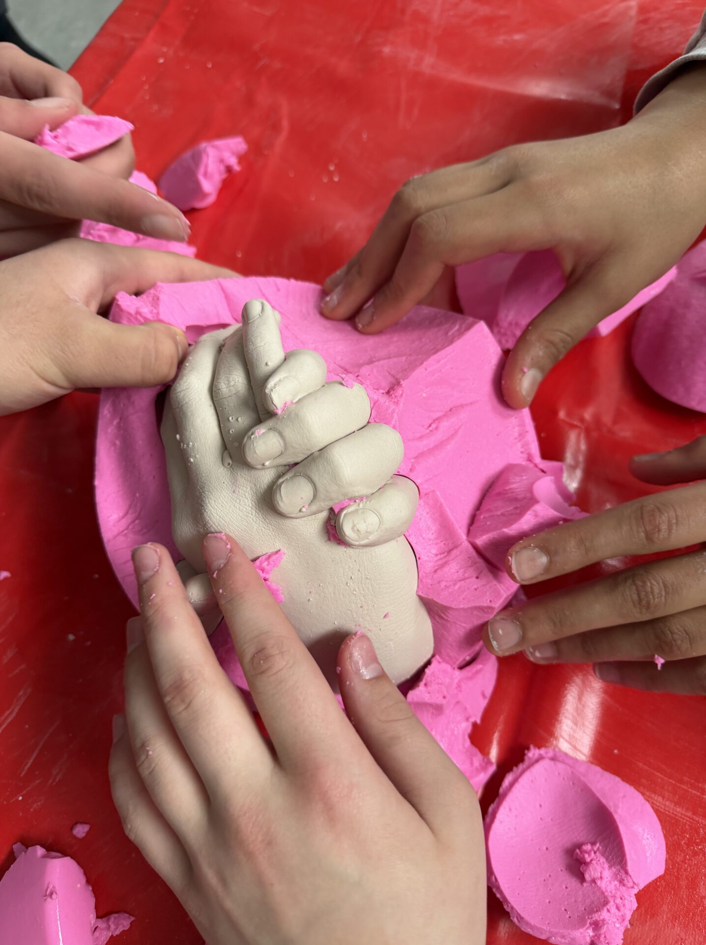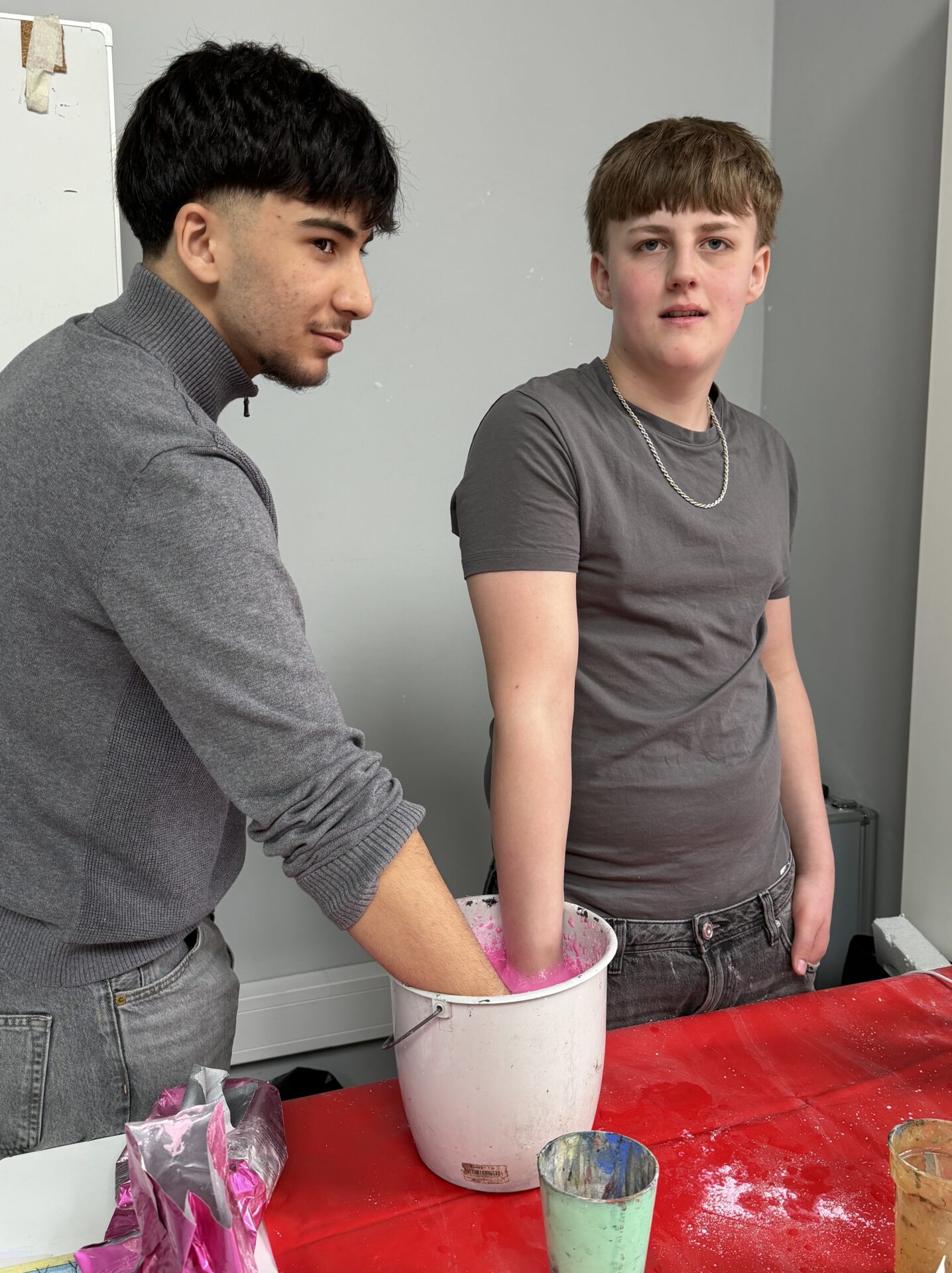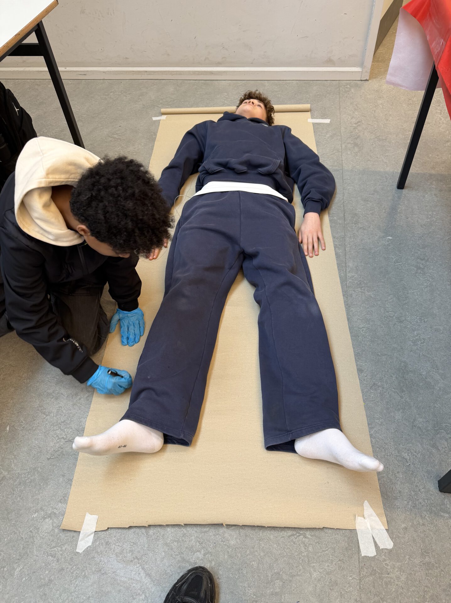Einige entwickeln gemeinsame Ideen. So wie Gabriel und Nio, die eigentlich einen großen Spiegel zuschneiden wollen.Wir behelfen uns mit Spiegelfolie, die in Lebensgröße zugeschnitten wird.