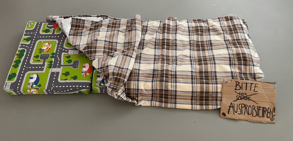 Meine Installation besteht aus einer Klappmatratze mit einer eingenähten Wolldecke. In die Decke habe ich zusätzlich eine Isolierfolie eingenäht, wie sie auch von Hilfsorganisationen genutzt wird, um Menschen vor Kälte zu schützen. Diese Materialien stehen für Wärme, Schutz und Überleben – Dinge, die für viele von uns selbstverständlich sind, für obdachlose Menschen jedoch nicht.
