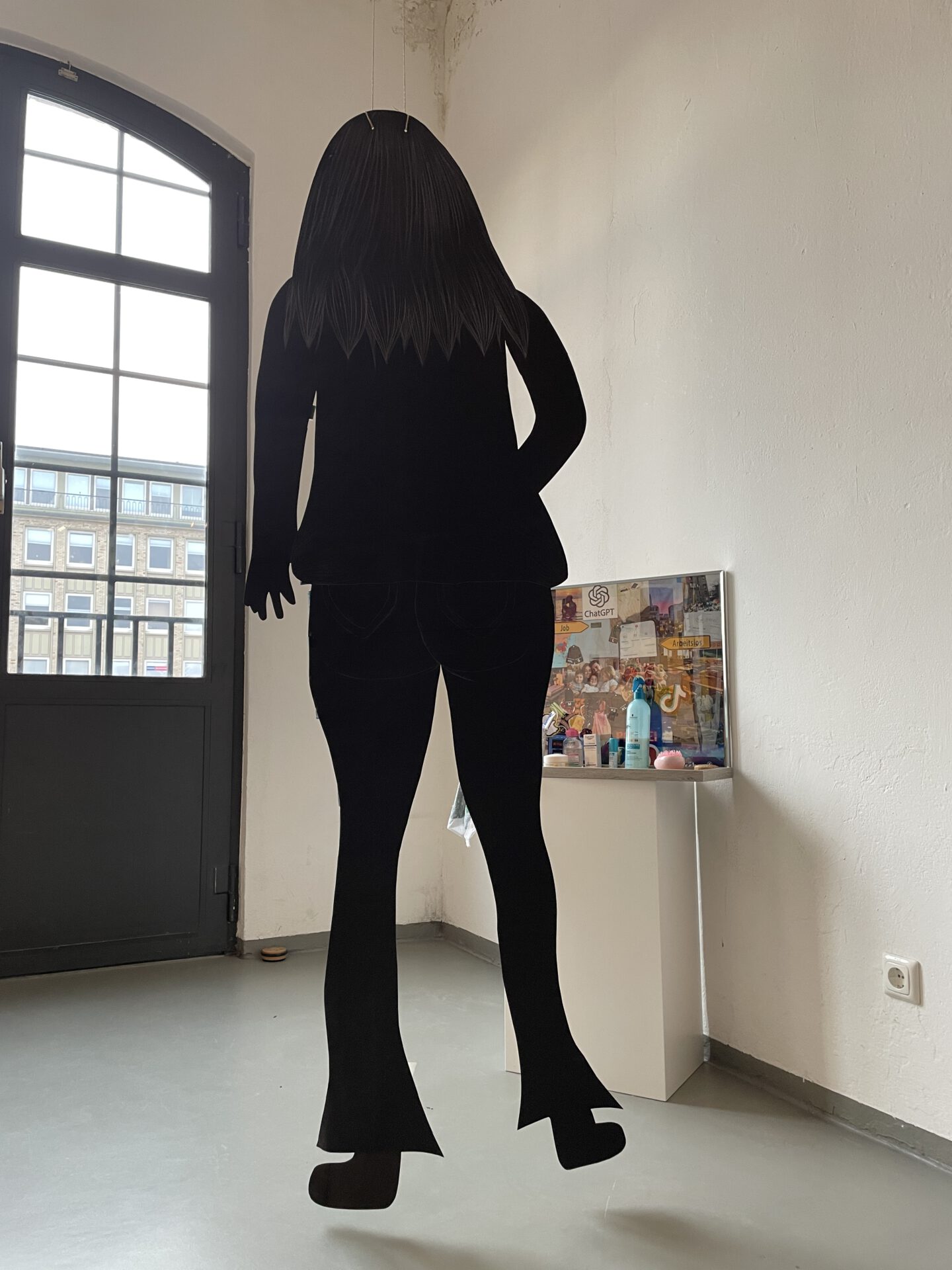 Ich habe versucht, eine Situation darzustellen, in der eine Figur vor einem Spiegel steht und sieht, was sie alles so beeinflusst. Hierbei habe ich mich bei dem Spiegel für eine Collage entschieden. Um die Figur gut sichtbar zu machen, habe ich mich dazu entschieden, diese in Lebensgröße darzustellen.