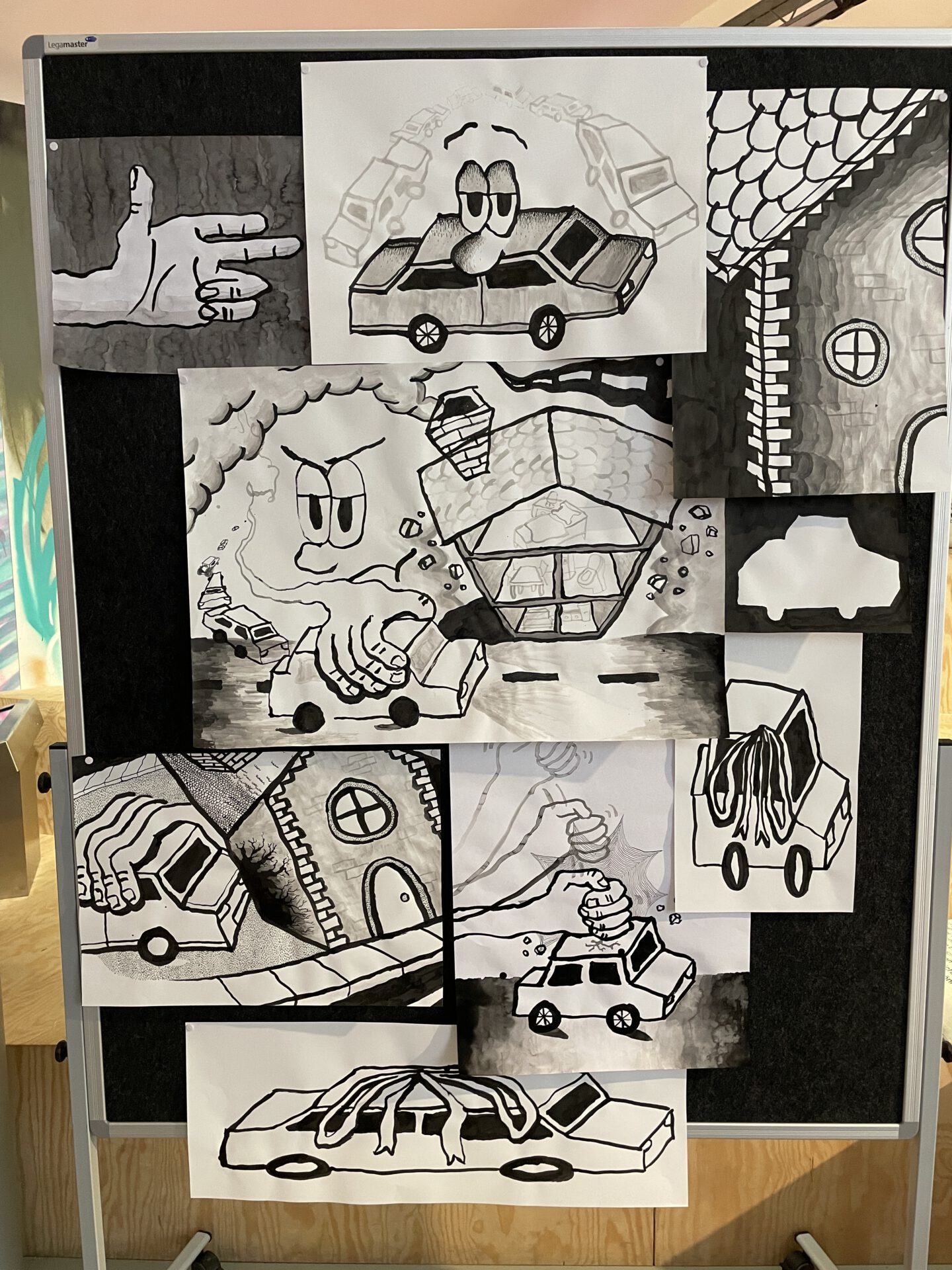 Viele Arbeiten waren interaktiv gestaltet. Es konnten Spiegel beschriftet, Postkarten entnommen und in die Rolle einer anderen Figur geschlüpft werden. Hier zeigte sich, dass viele Auszubildende besonders spielerische Elemente schätzen. Auch das Thema Spielzeug und seine Auswirkungen auf die emotionale Entwicklung von Kindern wurde in einigen Werken thematisiert. So krachte beispielsweise ein Spielzeugauto in ein Puppenhaus.