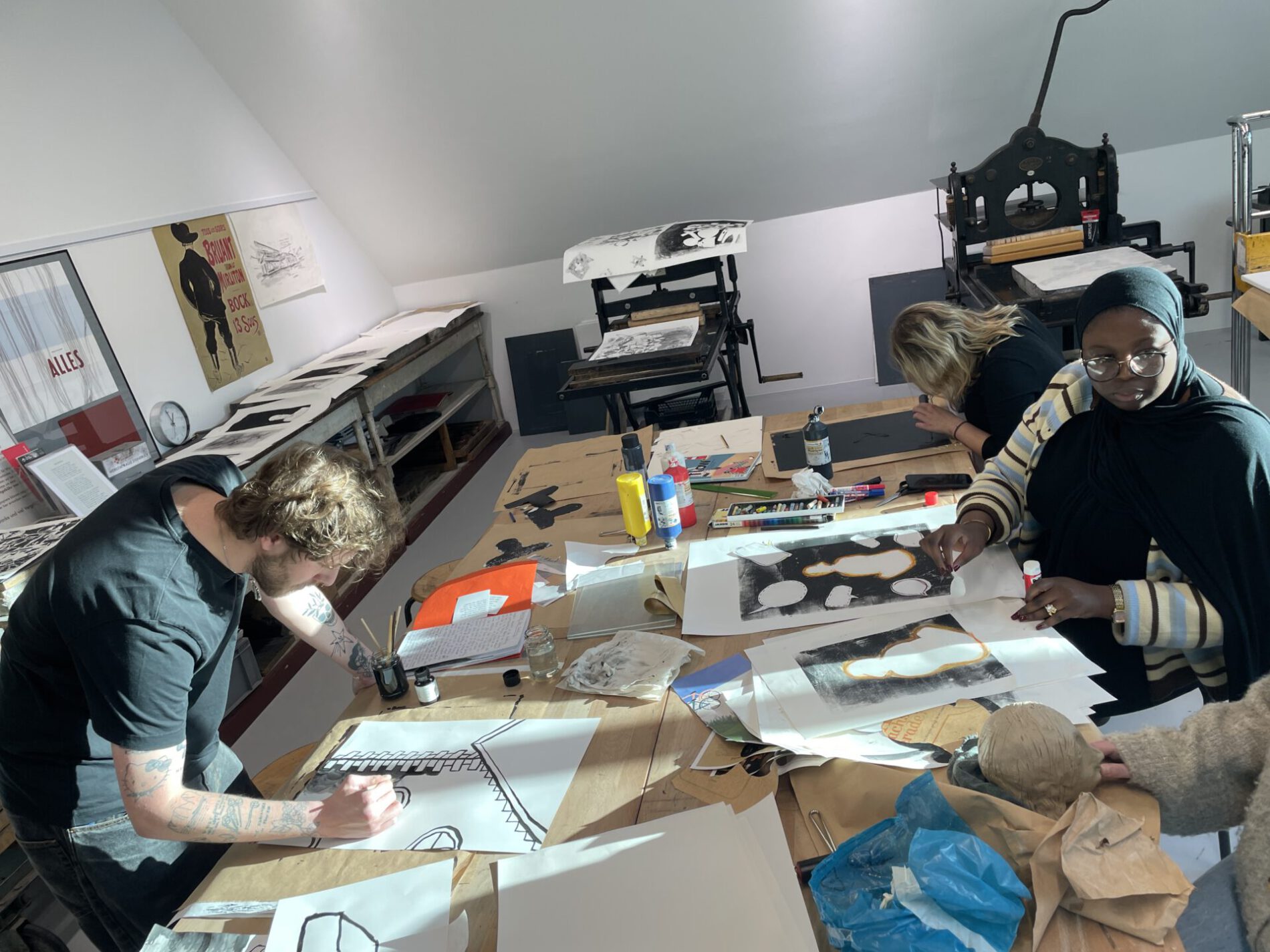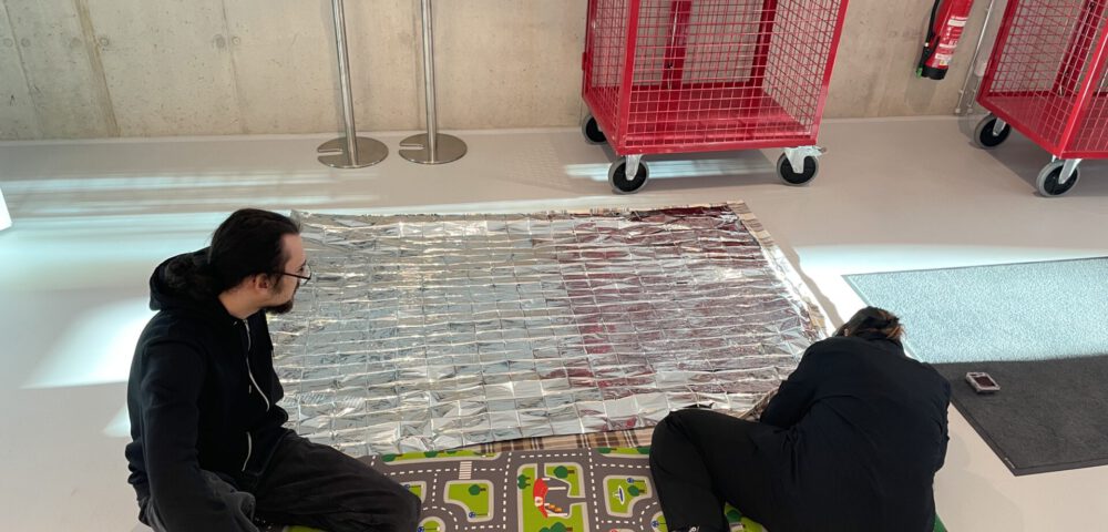 Begleitet von Muriel Zoe Borchert arbeiteten die Schüler:innen in der Lithografie-Werkstatt und experimentierten mit Monotypien. Sie zeichneten mit Tinte, arbeiteten mit Ton und Draht, gestalteten Leinwände und erstellten Collagen. Viele Schüler:innen entschieden sich für interaktive Installationen, in denen sie die zahlreichen interaktiven Elemente der Ausstellung aufgriffen. Sie entwickelten Kunstwerke, bei denen die Betrachtenden Position beziehen, entdecken, spielen und dem Werk eine eigene Richtung geben können. Eine Schülerin entschied sich, einen mobilen Schlafplatz für obdachlose Menschen zu entwickeln.